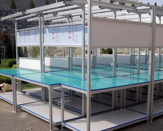 鋁合金工作臺,有型材框架,框架上面有臺板,兩側(cè)和背面有圍板。框架前面有柜門、抽屜等,型材的側(cè)面上沿型材長度方向橫截面是工字型槽,框架垂直連接的型材間有用螺釘相連的直二面角形的彎角連接件和方板型螺母。鋁合金工作臺連接強度高,拆裝方便。